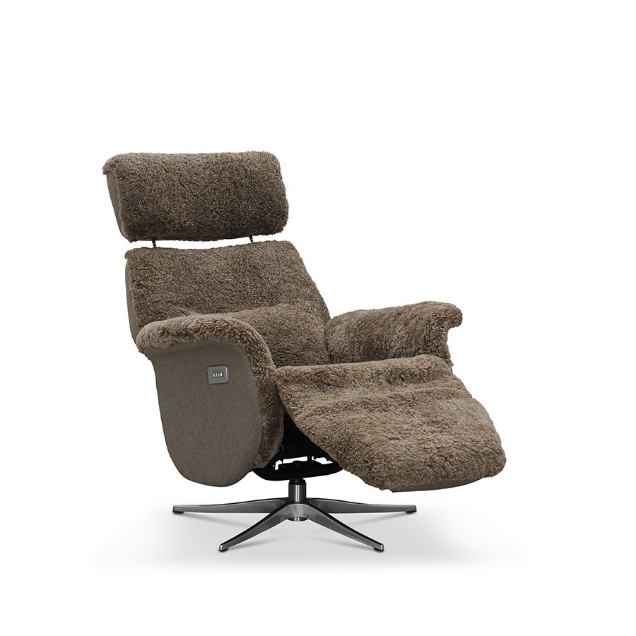 Lissabon snurrfåtölj i fårskinn med elektrisk flip-up och ställbart ryggstöd. Det går att reglera fotstöd och ryggstöd separat och den har reglerbart höj-och sänkbart nackstöd. Löstagbara armstödsskydd i tyg ingår. Finns i fårskinn grafit, mörkgrå och sahara.
