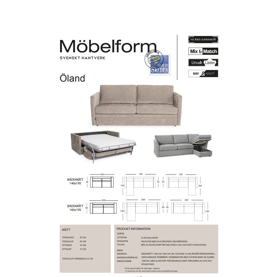 Bäddsoffa Öland är framåtbäddad med resårfjädrar bonell. Finns även med schäslong. Bäddmått 140x195. Priset avser 3-sits i tyg prisgrupp 1.