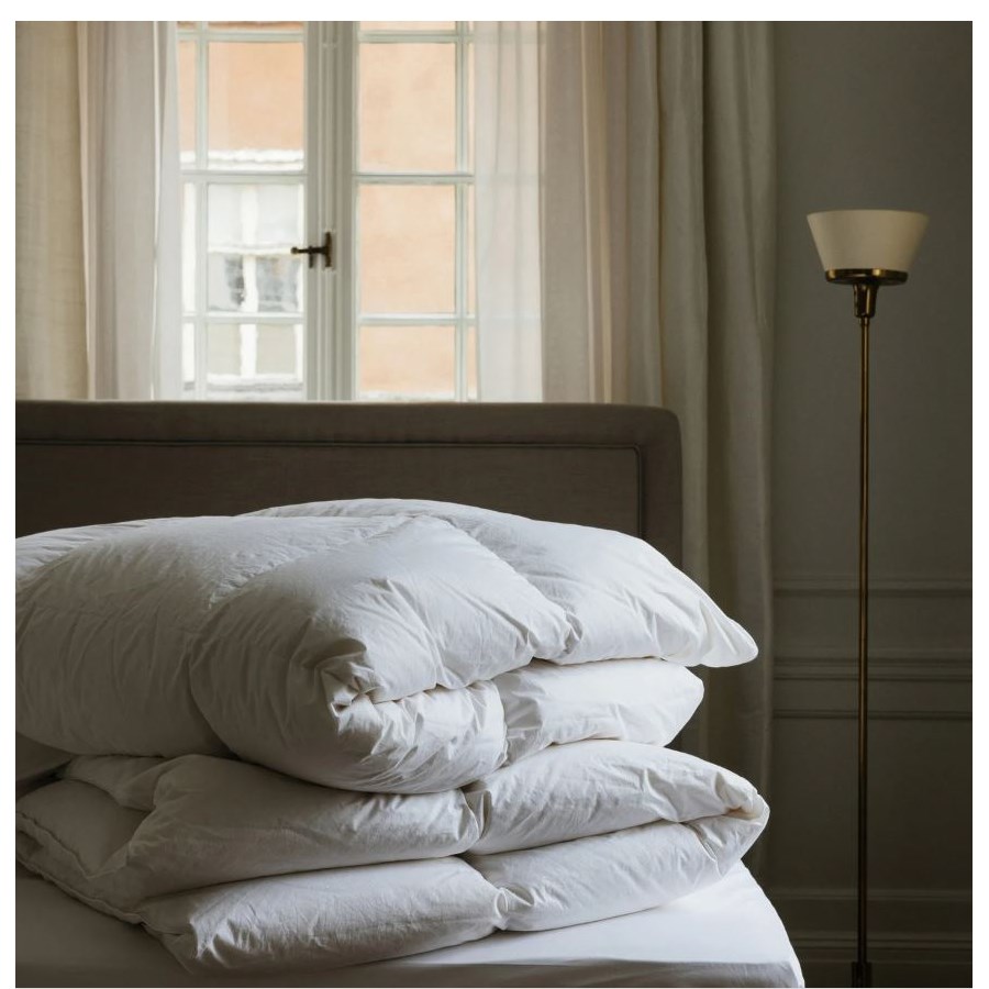 Lyxiga duntäcken fyllda med vitt gåsdun. Ju högre vikt på täcke, desto varmare. Sydda i vit duntät Macobomull med piping och fyllda med vitt gåsdun. 90% dunandel. Finns i flera olika storlekar och vikter. Frånpris storlek 220x220 cm.