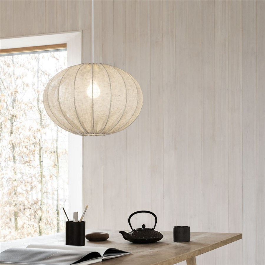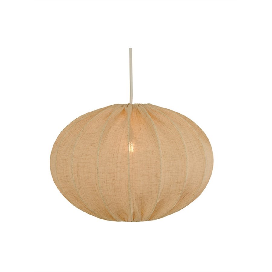 En pumpaformad taklampskärm i ett naturfärgat tyg i linnemix. Exkl takupphänge.