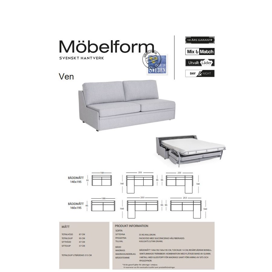 Bäddsoffa Ven är framåtbäddad med resårfjädrar bonell. Bäddmått 140x195 eller 160x195. Finns även med schäslong. Går att få både i tyg eller läder. Priset avser bäddsoffa 140 i tyg prg 1