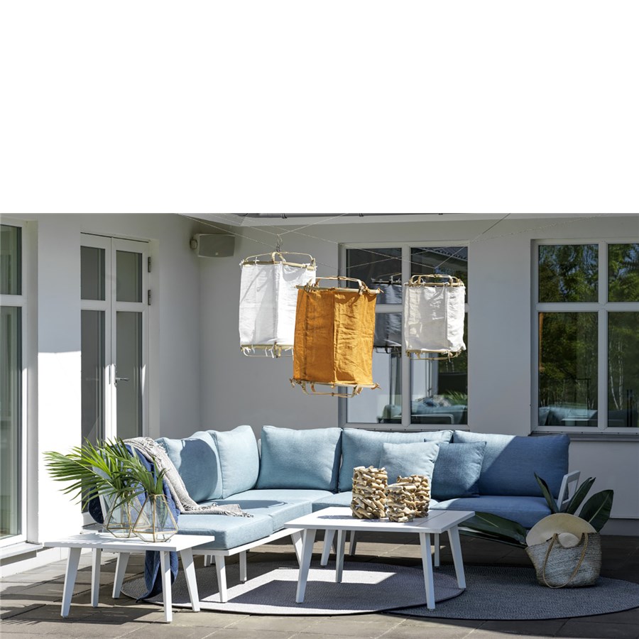 En modern modulbaserad loungegrupp i vitlackerad aluminium där du själv kan ta av och på armstöden och ryggstöden och på så sätt variera soffan.