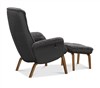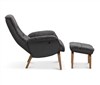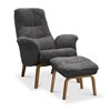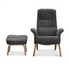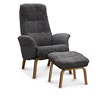 Visby ek har fällbart ryggstöd som formas efter rygg och nacke när det fälls bakåt. Fåtöljen har träben i ekfanér. Löstagbara armstödsskydd i tyg och pall ingår.