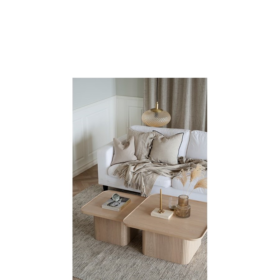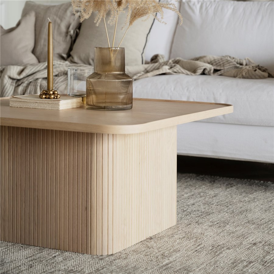 Sullivan är ett trendigt soffbord med ett linjerat mönster på foten och fanérad bordsskiva med rundade hörn. Finns i svart, brun och vitpigmenterad ek i två olika storlekar.