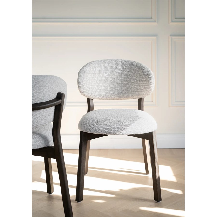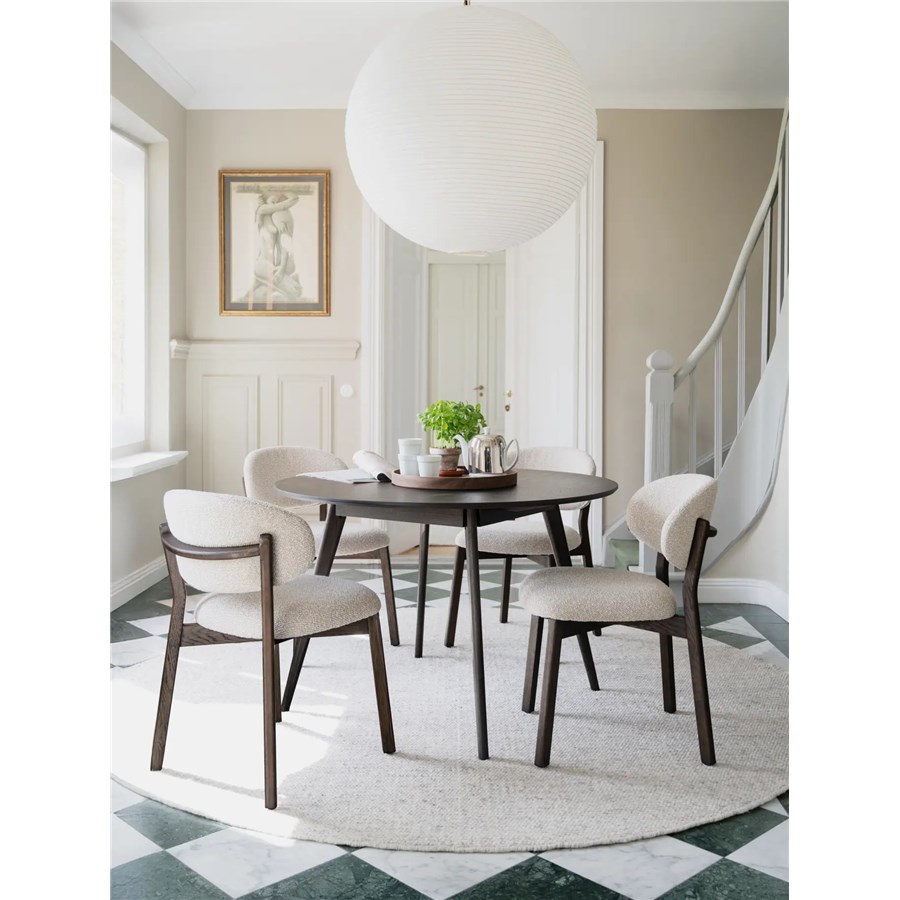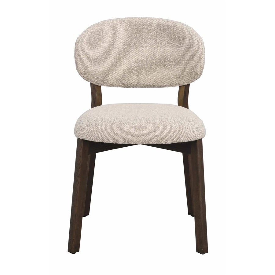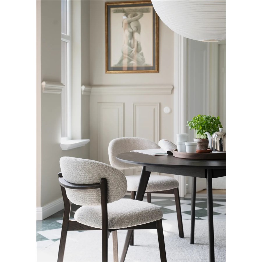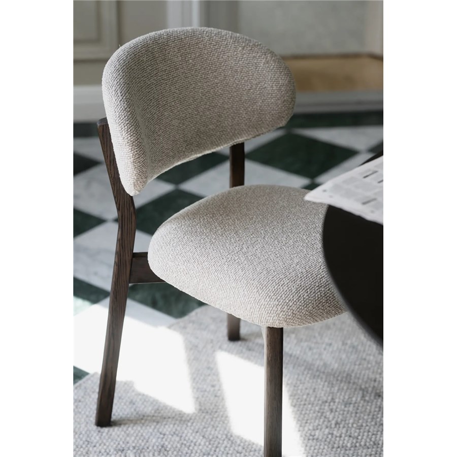Patterson stol i massiv brun ek och med en tjock ryggbricka och sits i beige tyg som ger en generös och bekväm sittupplevelse.