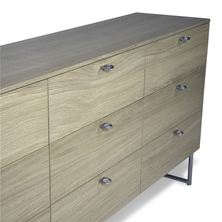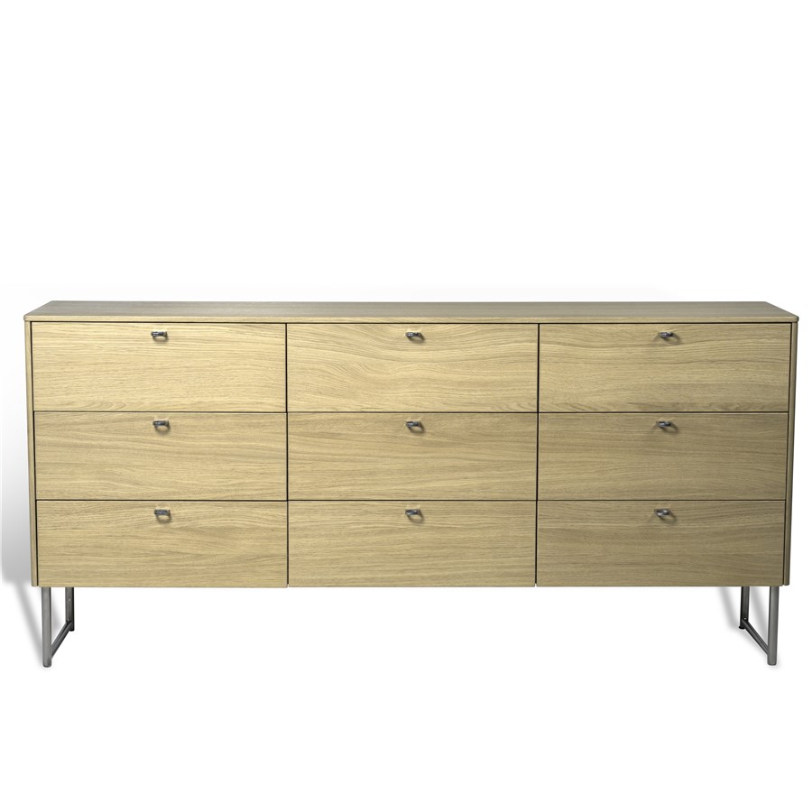 Deus byrå har rundat hörn i framkant och mjukstängande lådor. Detaljrikt underrede i stål.