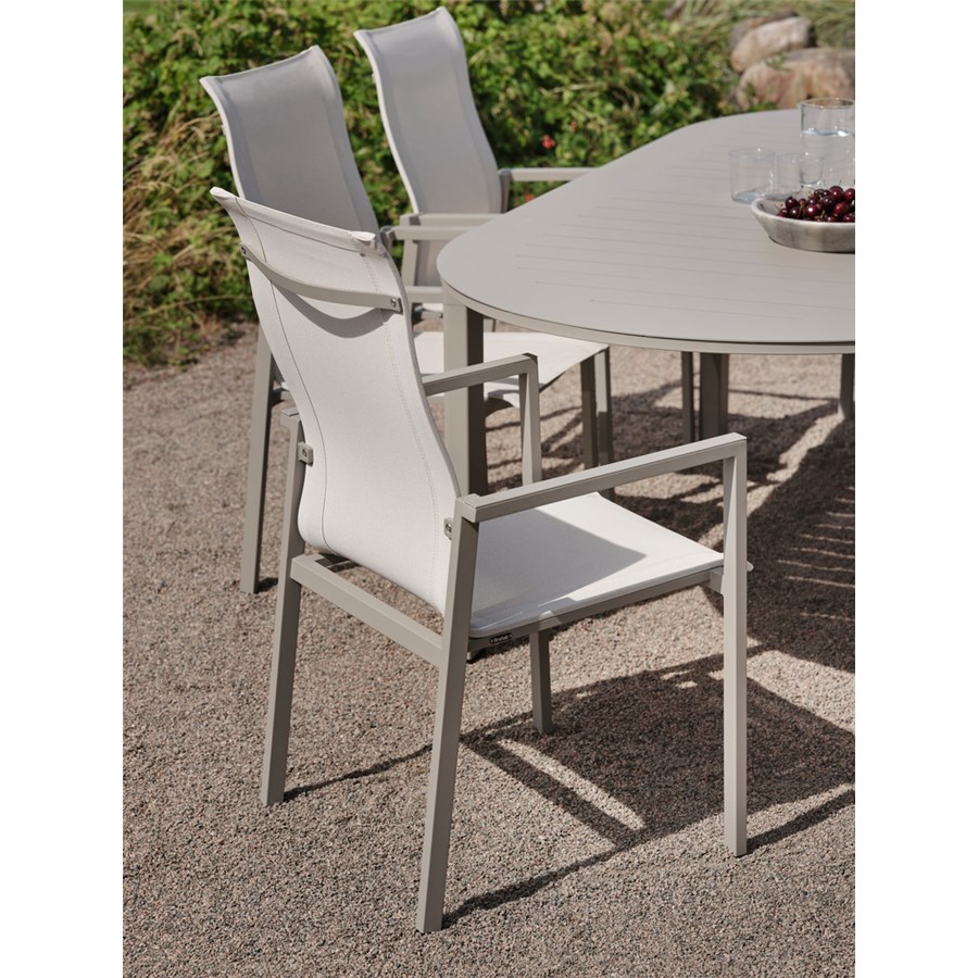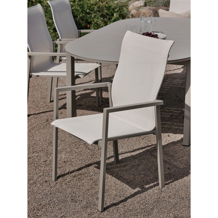 Bekväm matstol i aluminium och textilene. Finns i tre olika färger. För extra komfort köp till sittdyna Frisk.
