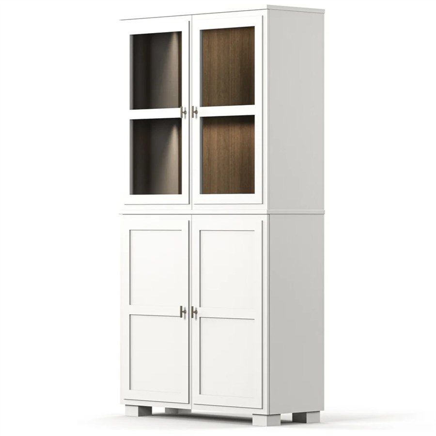 Camden är en ny serie från Englesson. Här ett vitrinskåp med två glasdörrar, två täckta dörrar, två hyllor och en låda. Skåpet har inbyggd belysning.