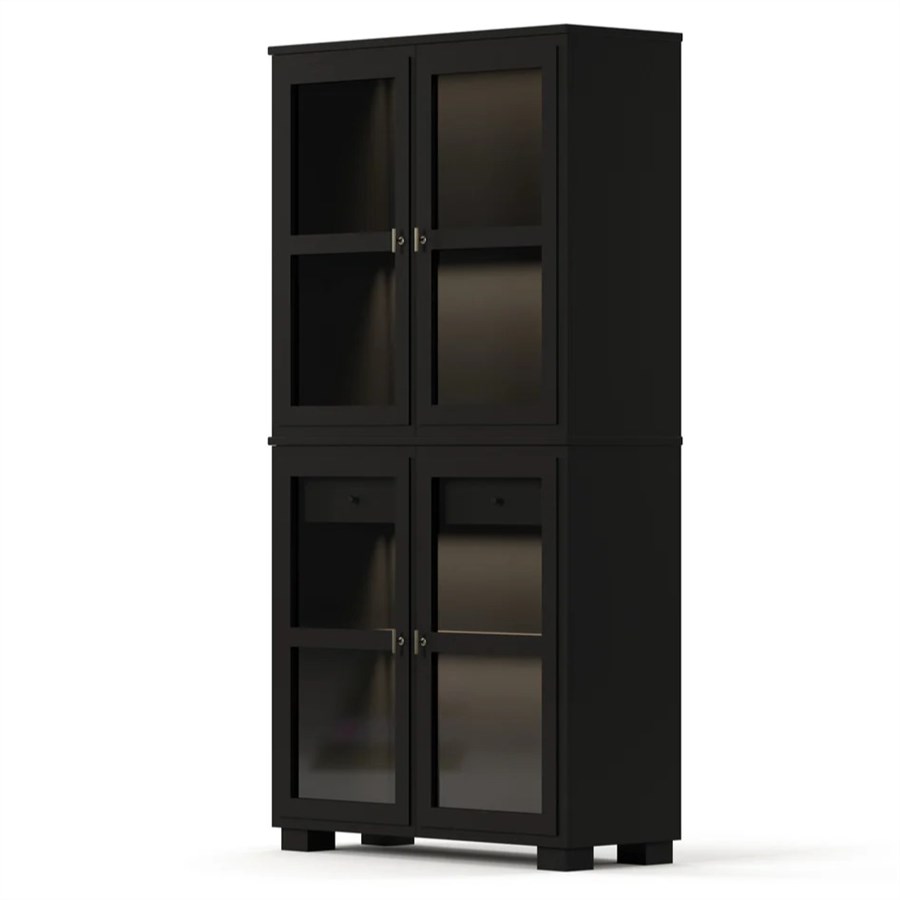 Camden är en ny serie från Englesson. Här ett vitrinskåp med fyra glasdörrar, två hyllor och en låda. Skåpet har inbyggd belysning.