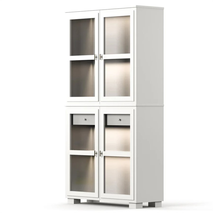 Camden är en ny serie från Englesson. Här ett vitrinskåp med fyra glasdörrar, två hyllor och en låda. Skåpet har inbyggd belysning.