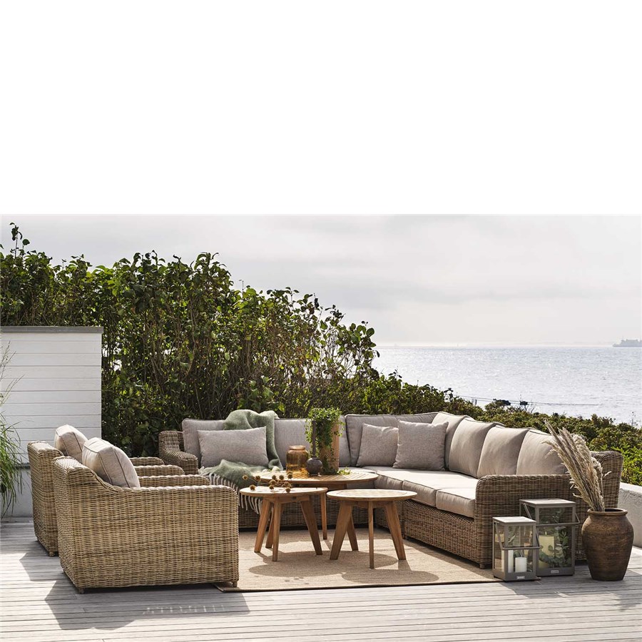 Klassiska möbler i konstrotting med rustikt utseende. Beigefärgade dynor ingår.